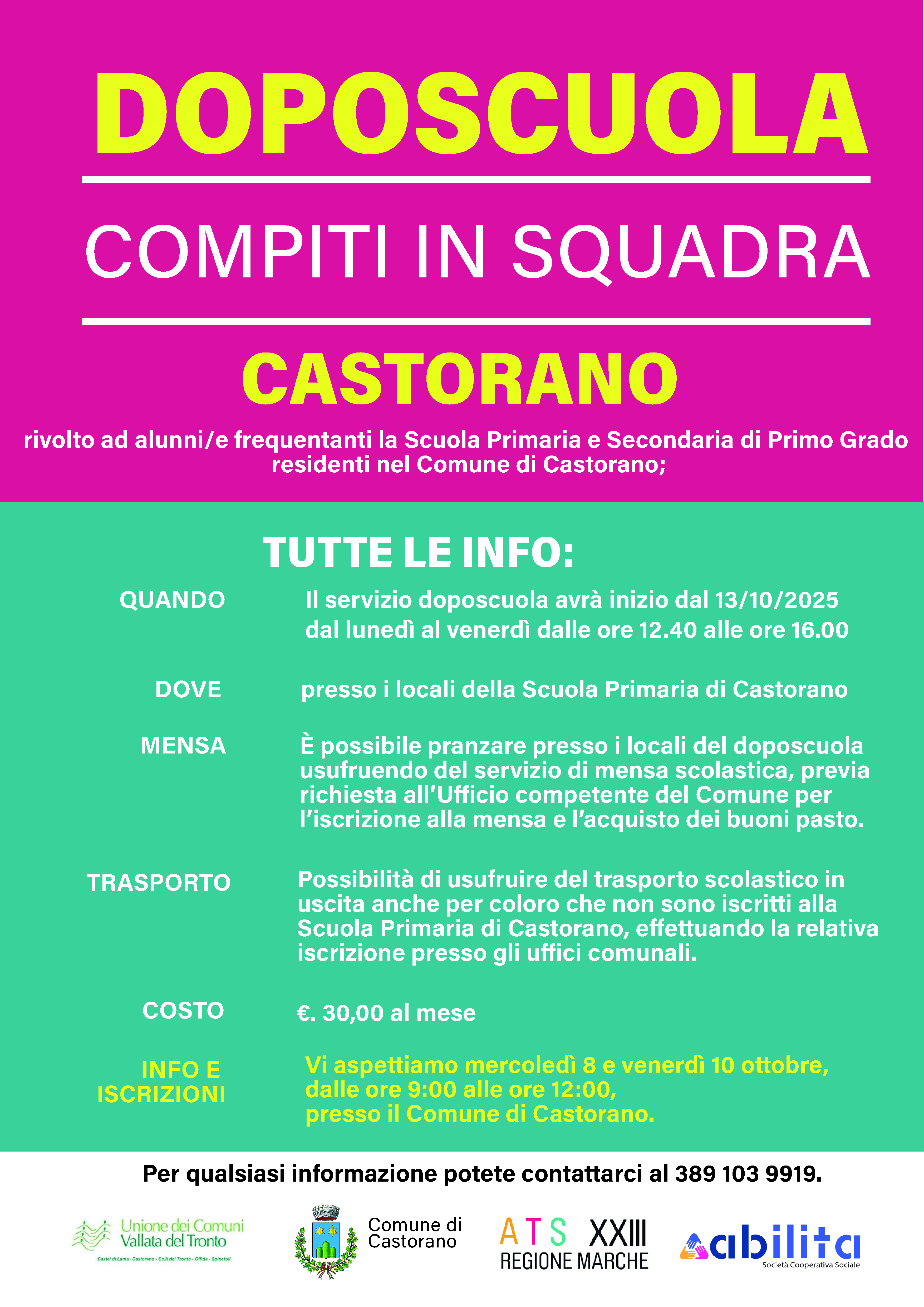 Il doposcuola avrà sede presso la Scuola primaria di Castorano dalle ore 12:40 alle ore 16:00.